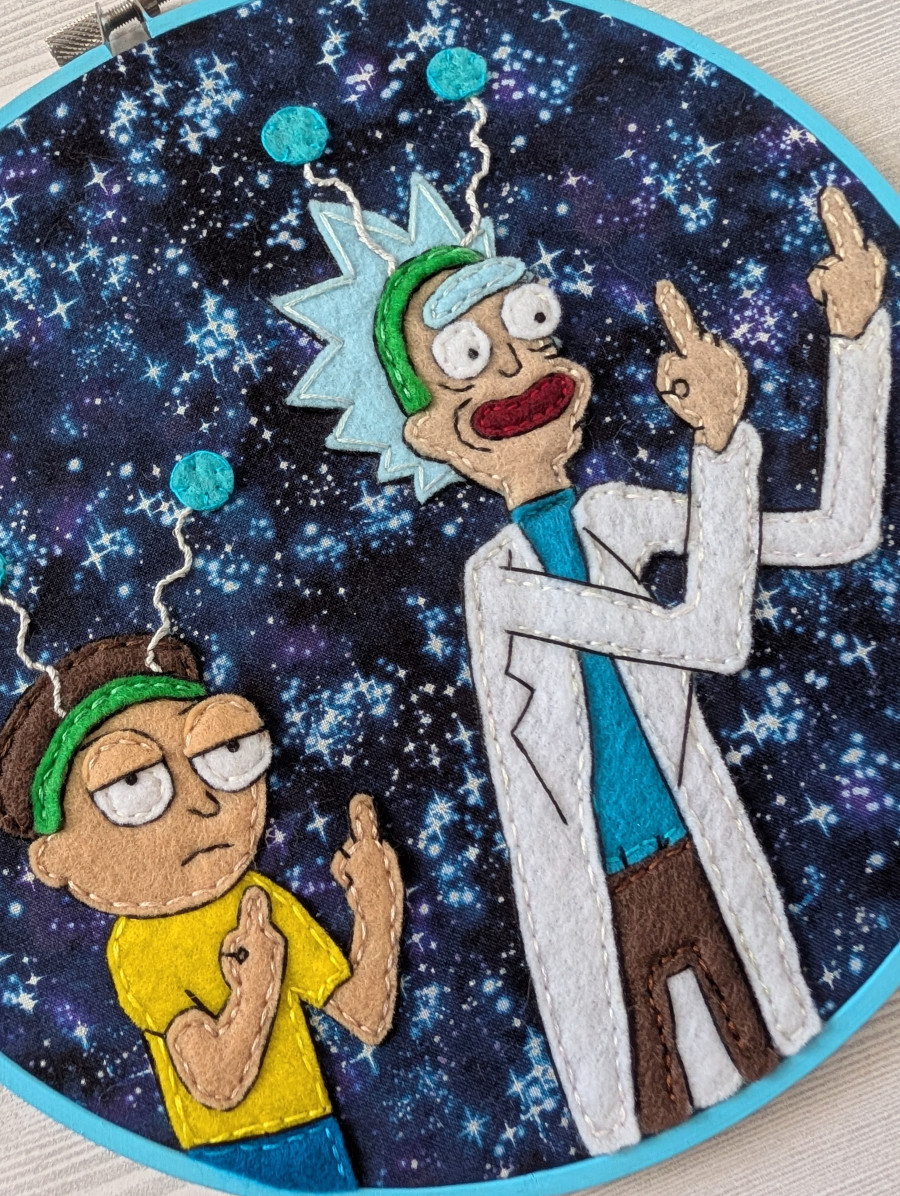 Greetings and Peace Among Worlds! Bring some interdimensional humor to your own personal citadel with this handmade, one of a kind, 9 inch felt embroidery. The hoop is a durable painted wood and created with felt and fabric, able to hang on the wall with a nail going through the opening at the top. Wubba Lubba Dub Dub!