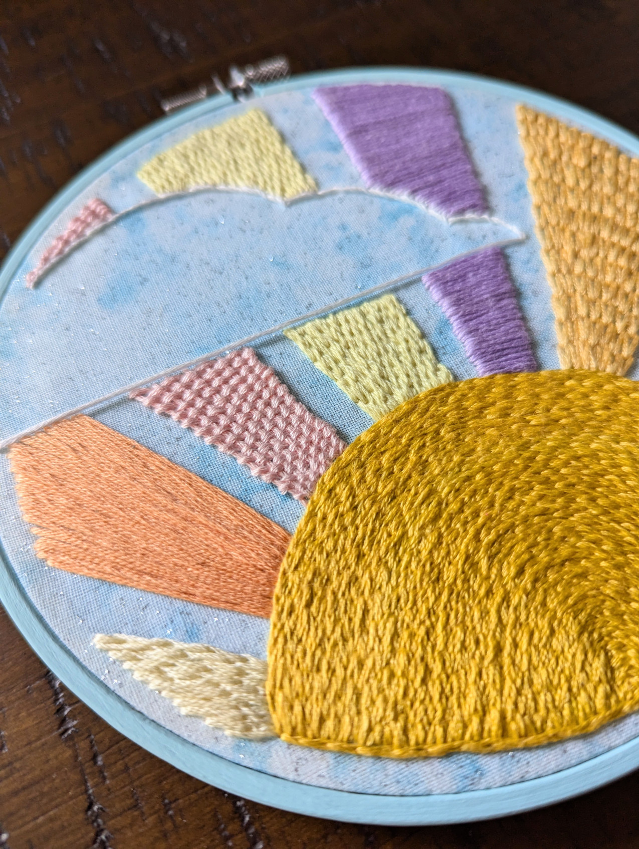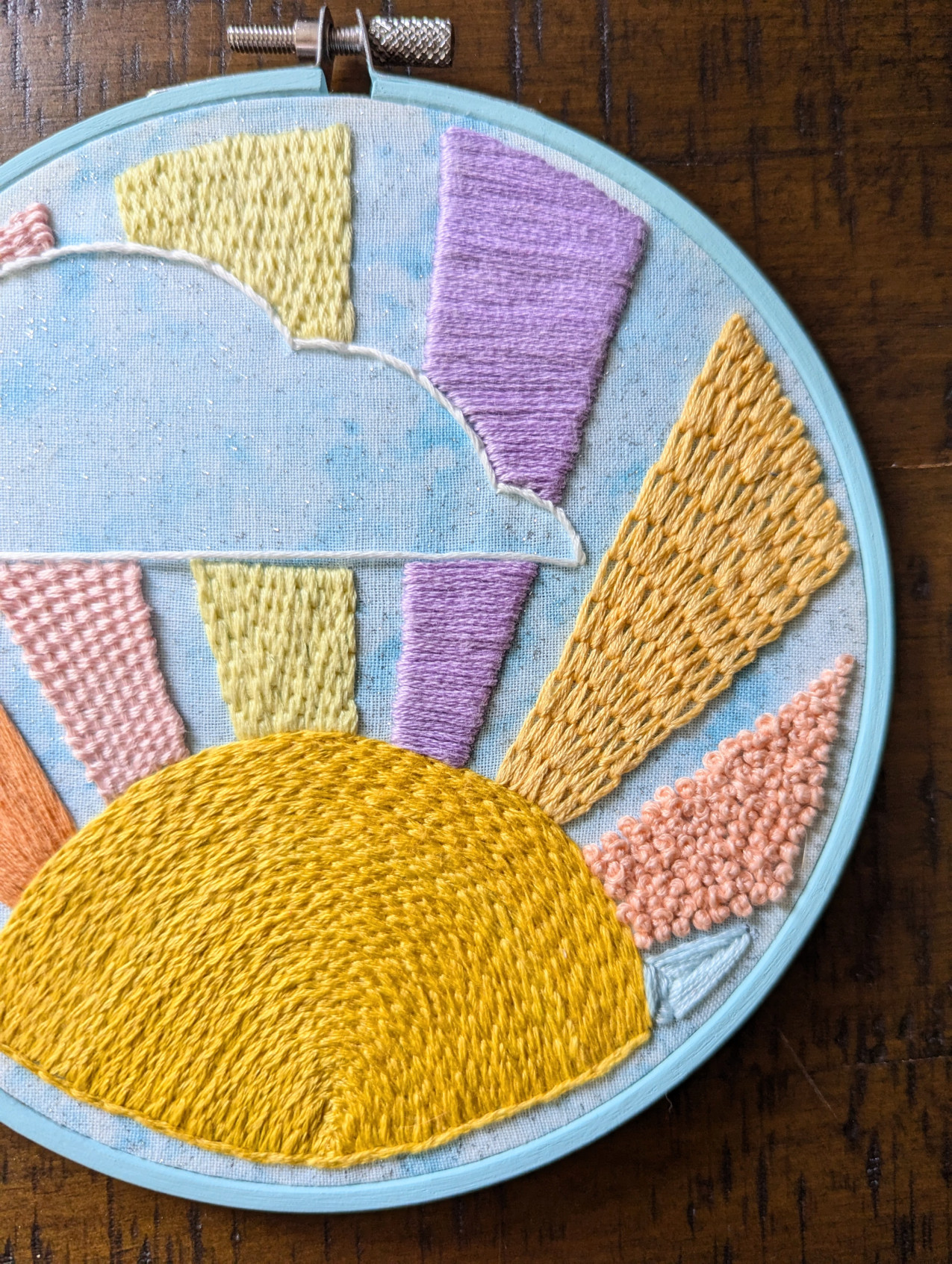 "Here comes the sun and I say, it's all right" -The Beatles Enjoy this handmade, one of a kind, 6 inch embroidery hoop. The hoop is a durable painted wood, created with fabric and embroidery floss, able to hang on the wall with a nail going through the opening at the top. Perfect for every room, to bring some sunshine and positivity to your everyday!