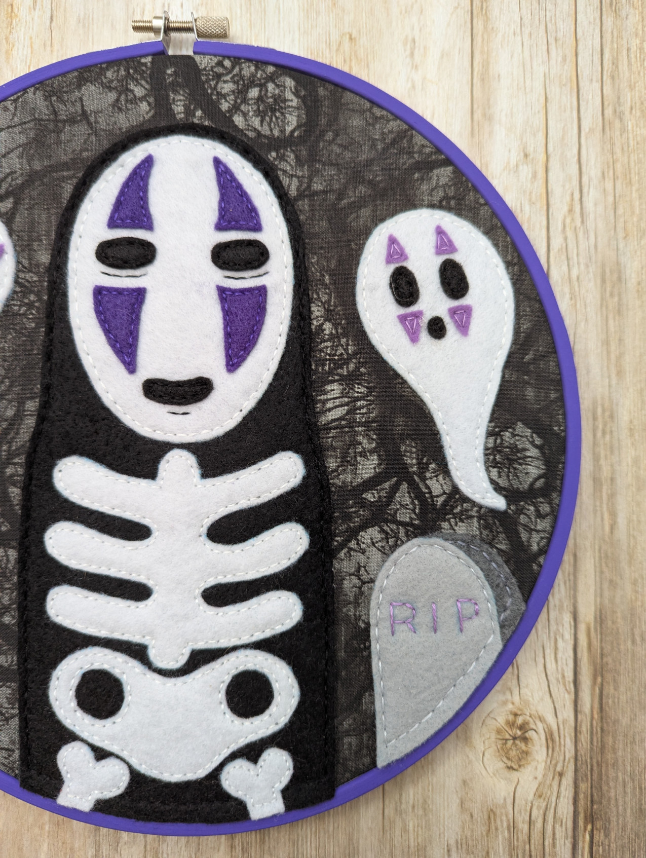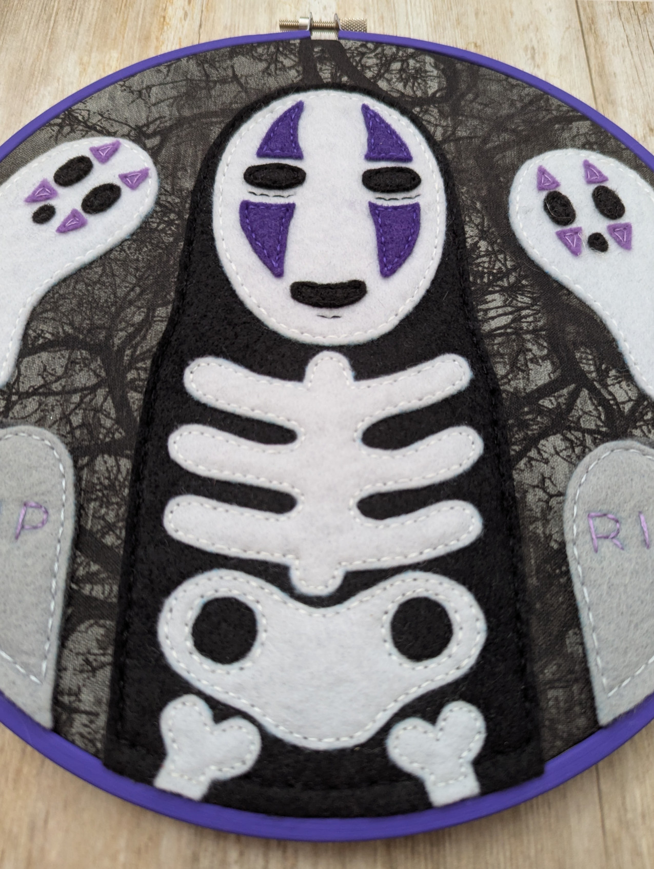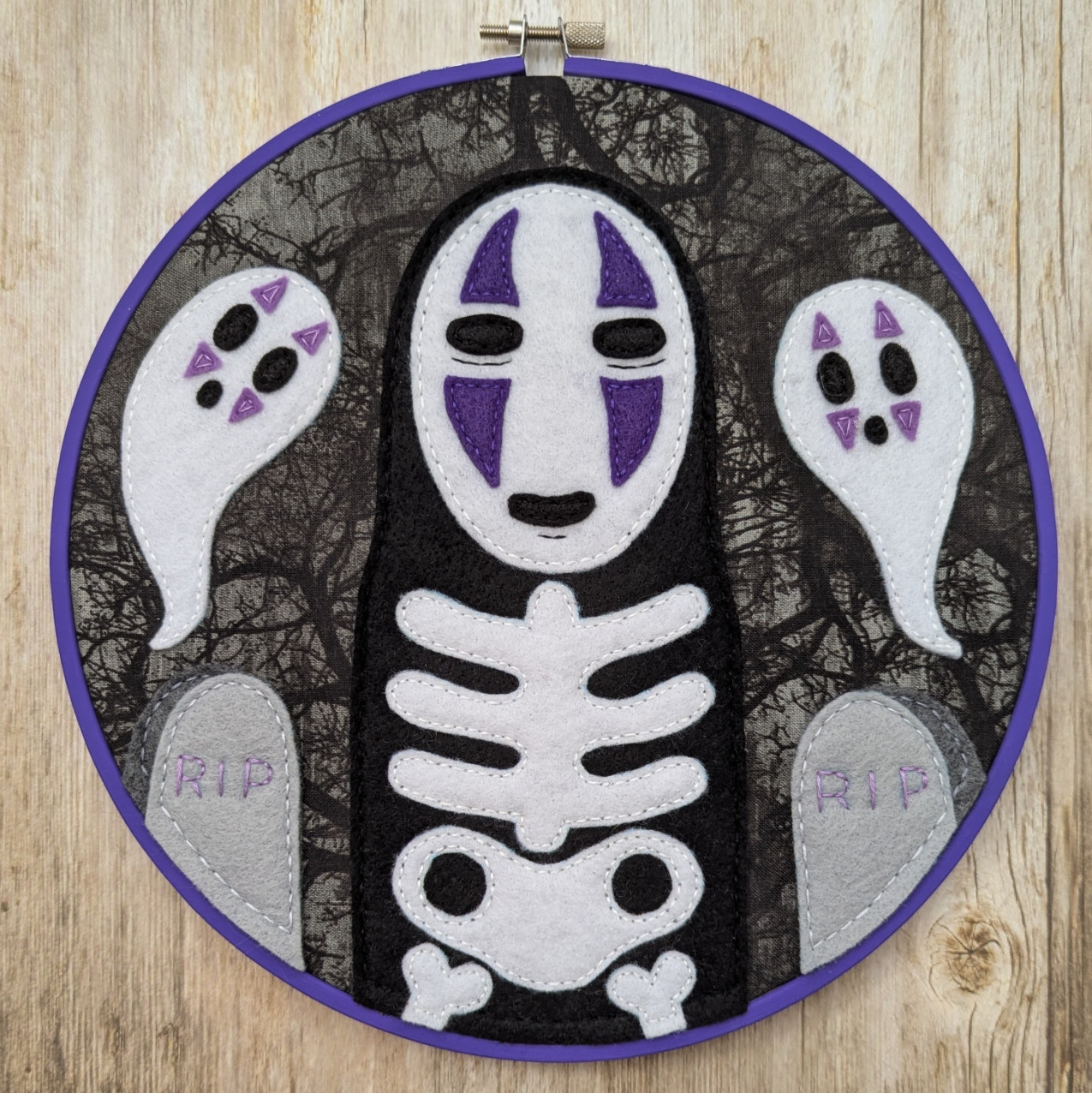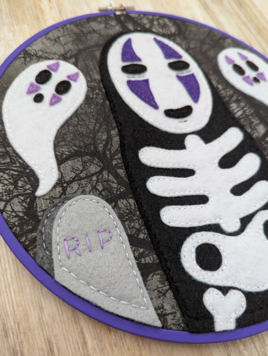 No one should every feel lonely! So hang out with No Face and his ghostly friends this Halloween, with this one of a kind, 9 inch felt embroidery. The hoop is a durable painted wood, created with felt and fabric, able to hang it on the wall with a nail going through the opening at the top. Once you've met someone, you never really forget them. It just takes a while for your memories to return. <3