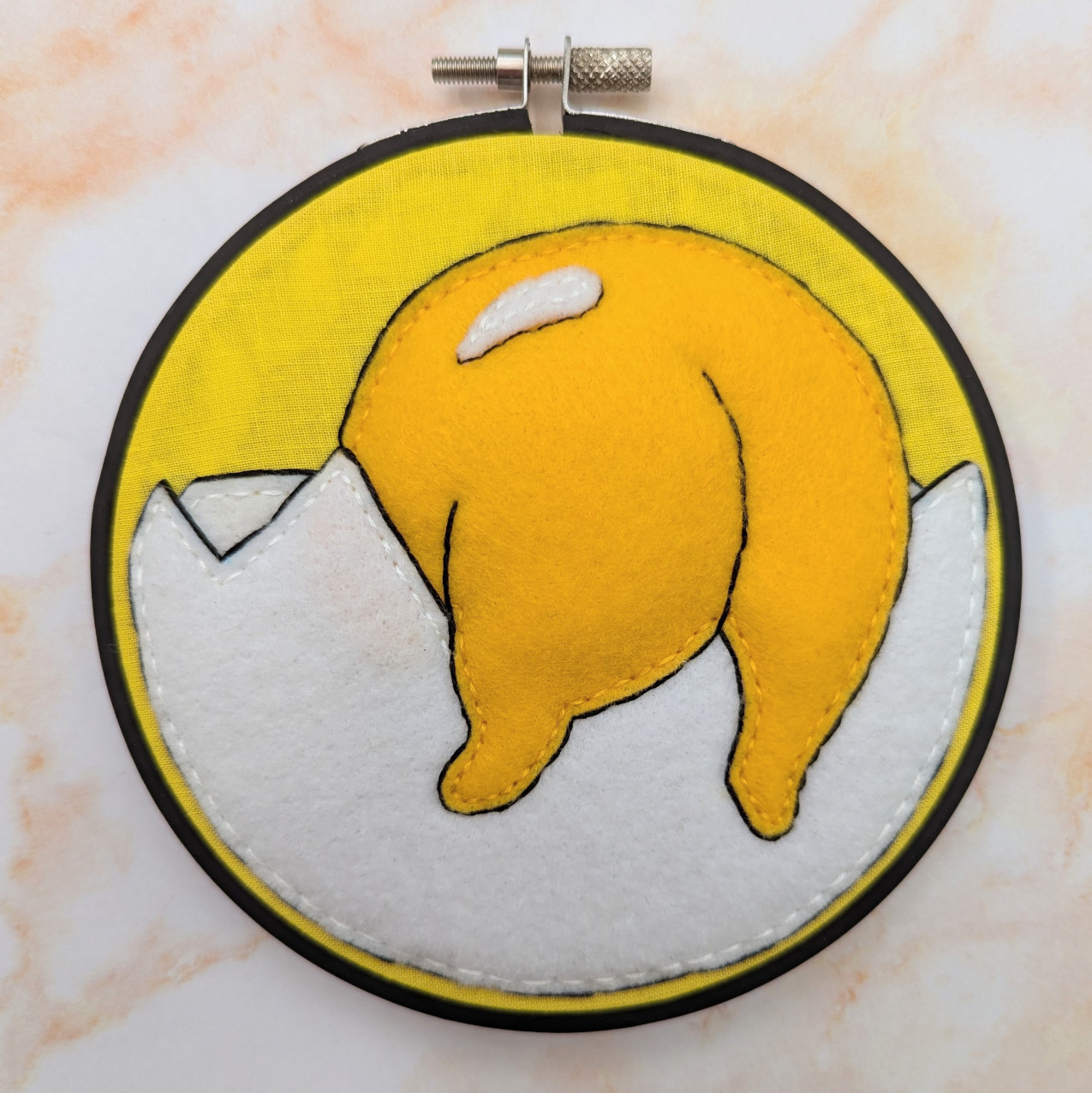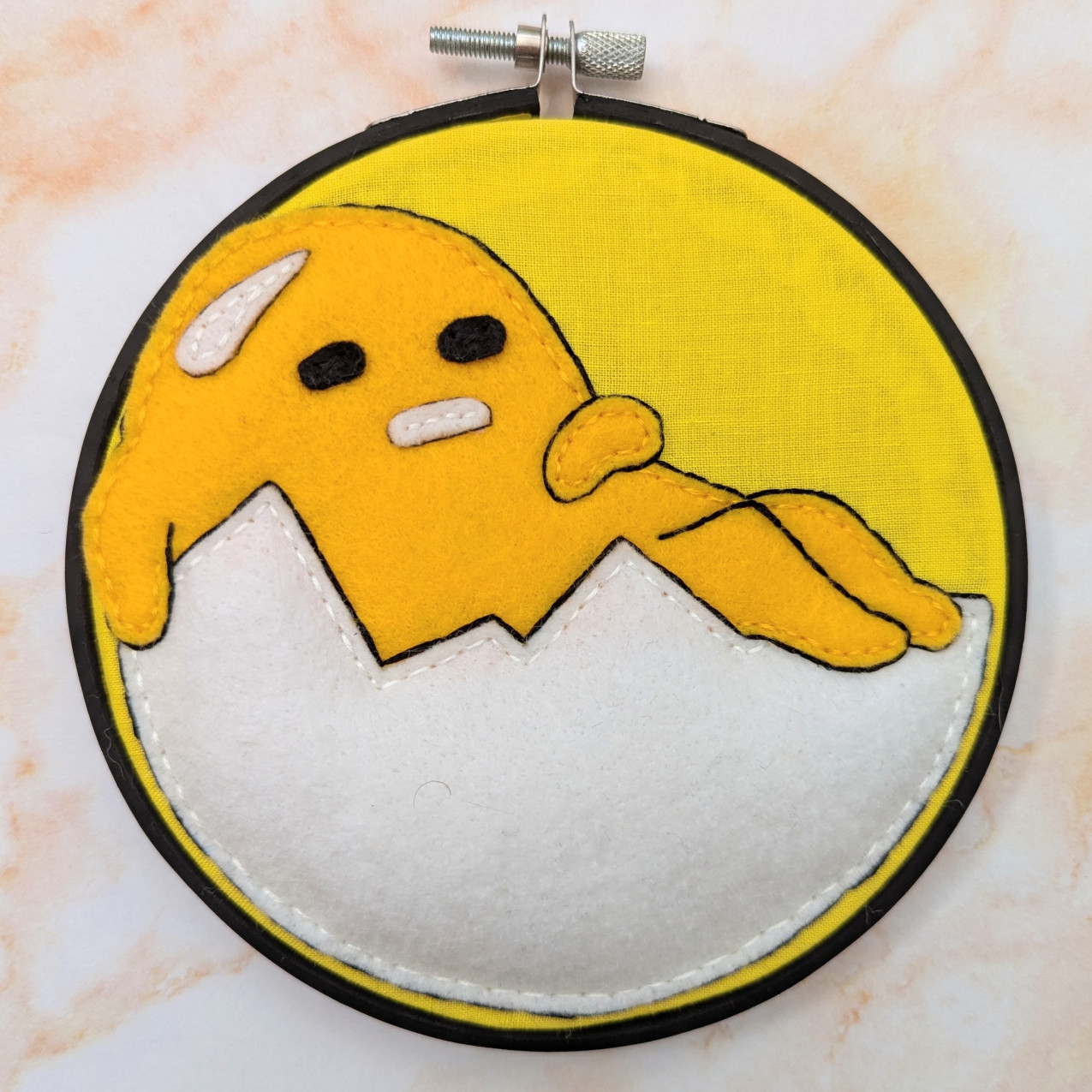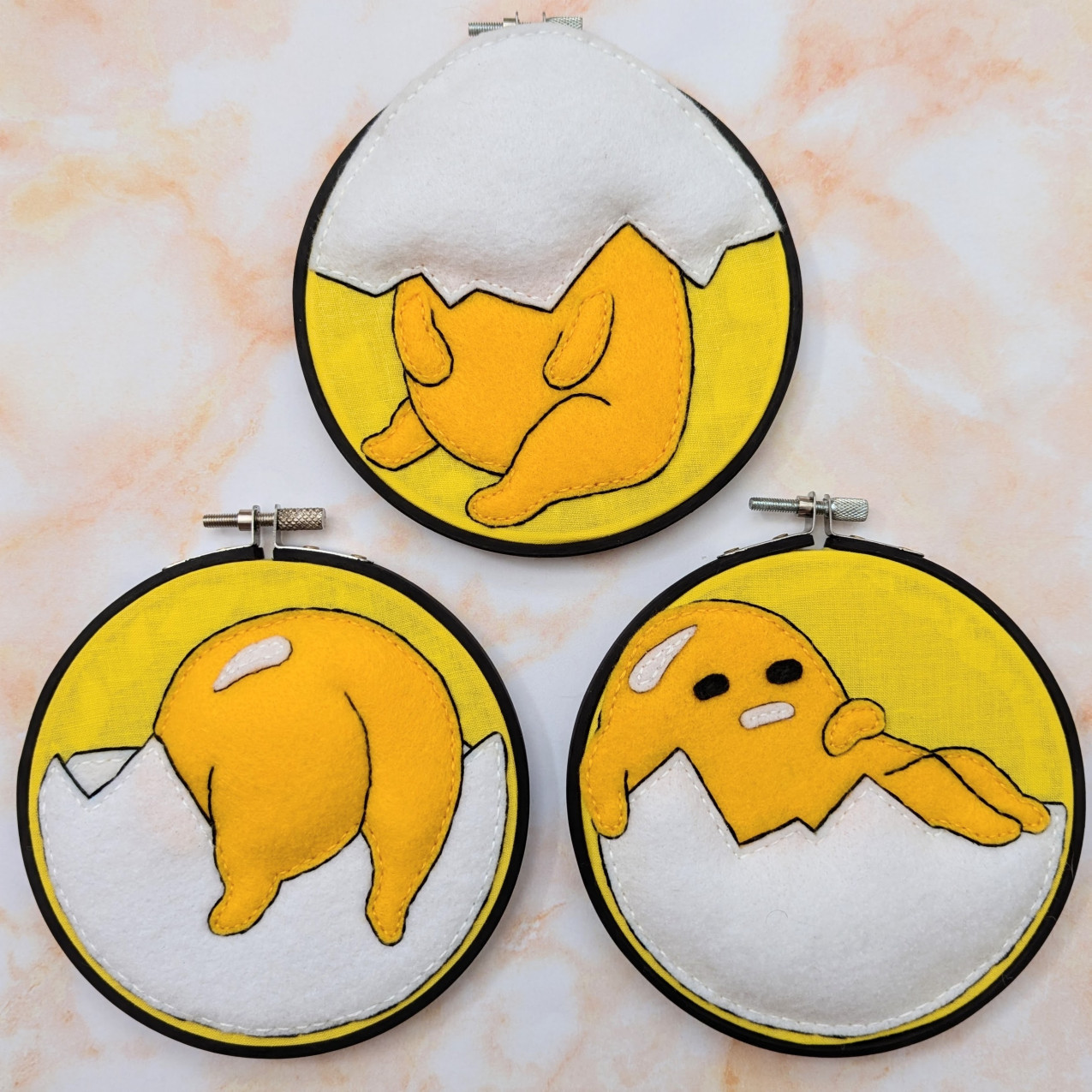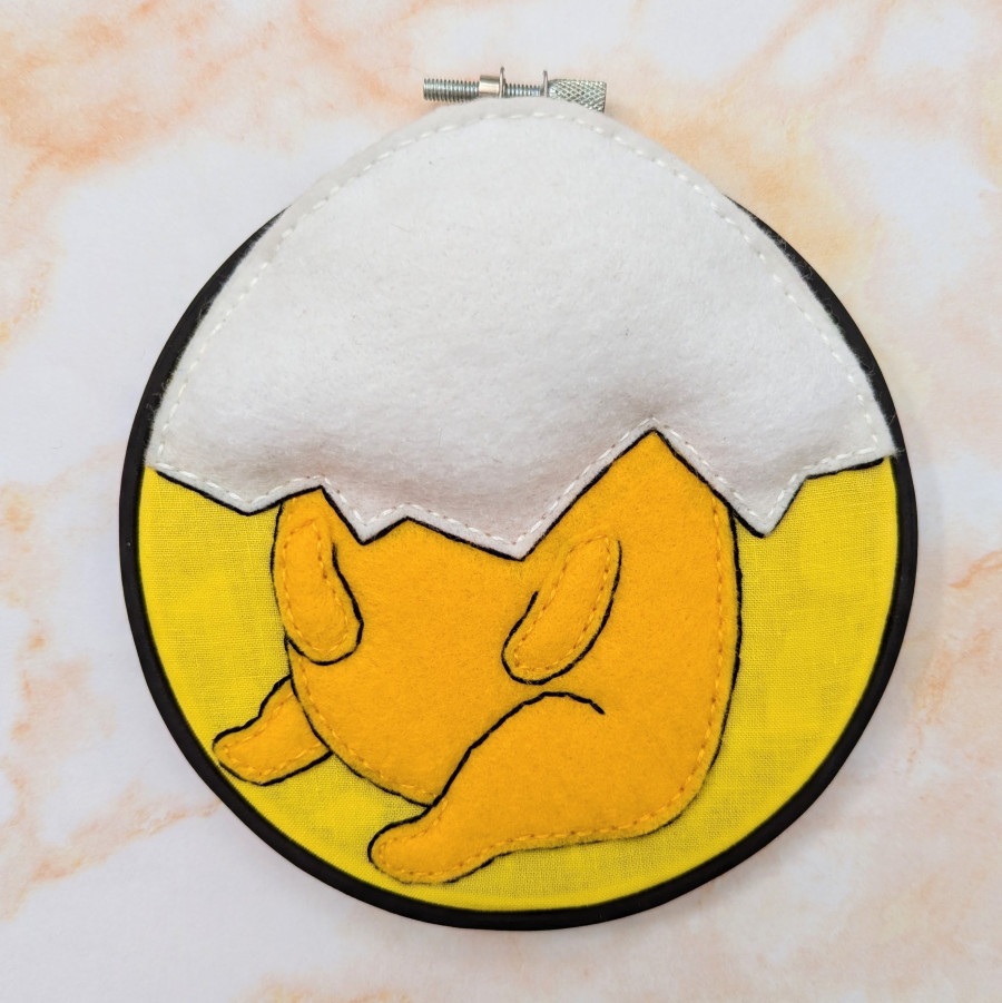 Ahh! So Lazy! These are handmade, one of a kind, 5 inch felt embroideries of Gudetama, the adorable lazy egg. All three hoops are a durable painted wood and created with felt, fabric, and fluff, because let's face it, we all want to touch his butt. These are able to hang on the wall with a nail going through the opening at the top. WARNING : Not Edible! <3